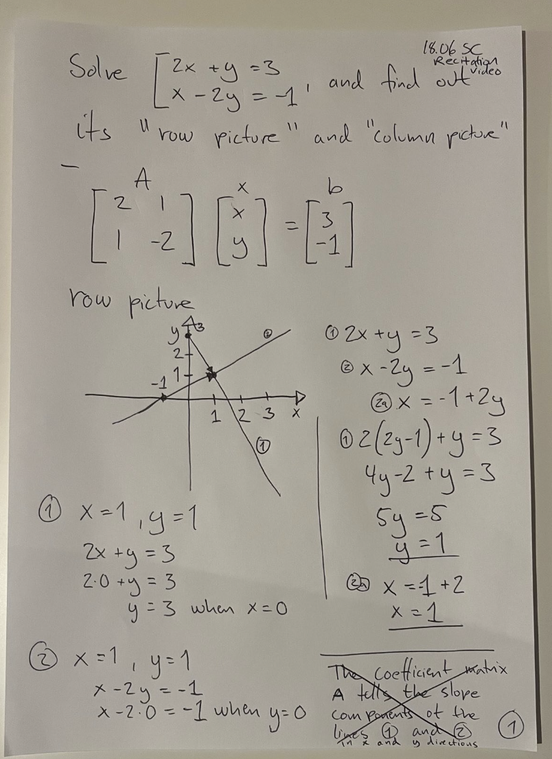 0.0.5 - The Geometry of Linear Equations 2023-08-18 Solving the problem from the 1. recitation video from the MIT course “18.06SC – Linear Algebra”.